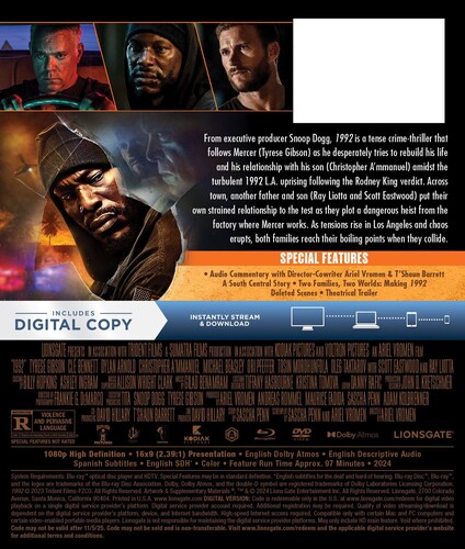 In April 1992, as the streets of L.A. exploded in the wake of the Rodney King verdicts, Mercer Bey (Tyrese Gibson) concluded that the safest place that he and his son Antoine (Christopher Ammanuel) could wait out the chaos was the metals factory where he worked. Unfortunately, that conflicted with the plans of father-and-son heist artists Lowell (Ray Liotta) and Riggin (Scott Eastwood), looking to boost millions in platinum while the cops had their hands full. Clé Bennett, Ori Pfeffer co-star. 96 min. Widescreen; Soundtrack: English.