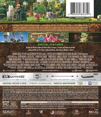 Four disparate losers (Jason Momoa, Danielle Brooks, Emma Myers, and Sebastian Hansen) were inexplicably drawn into the dimension known as the Overworld, where everything is built from voxels, and where imagination is the only limit. They'll need guidance from an amiable local (Jack Black) to obtain the skills to survive, let alone get home, in this epic adventure-comedy inspired by the sandbox video game. Jennifer Coolidge, Rachel House co-star; Jared Hess ("Napoleon Dynamite") directs. 100 min. Widescreen; Soundtrack: English.