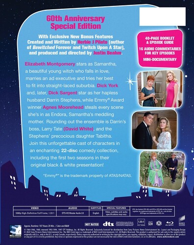 Elizabeth Montgomery stars as Samantha, a beautiful young witch who falls in love and marries an ad exec, trying her best to fit into the straightlaced suburbia. D. York and, later, D. Sargent star as her hapless husband Darrin Stephens, while Emmy(r) Award winner Agnes Moorehead steals every scene she's in as Endora. Samantha's meddling mother. Rounding out the ensemble is Darrin's boss, Larry Tate (David White), and the Stephens' precocious daughter Tabitha. Join this unforgettable cast of characters in an enchanting 22-disc comedy collection, including the first two seasons in their original black & white presentation!