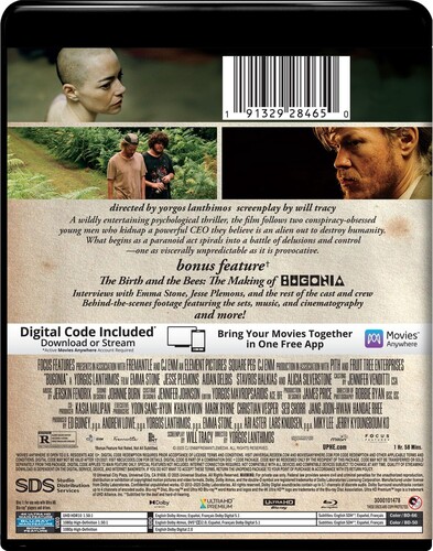 Big Pharma CEO Michelle Fuller (Emma Stone) found herself unexpectedly confronted by something worse than a bad quarter-abduction by unstable cousins Teddy and Don Gatz (Jesse Plemons, Aidan Delbis), both sure she's an alien emissary readying Earth for incursion. Her gambit for talking herself out of the dicy circumstances will take jaw-dropping turns in Yorgos Lanthimos' darkly comic redo of the 2009 Korean opus "Save the Green Planet!" Alicia Silverstone, Stavros Halkias co-star. 118 min. Widescreen; Soundtrack: English. Bonus Content: Includes 4K UHD, Blu-ray and a digital copy of Bugonia (Subject to expiration. Go to NBCUCodes. Com for details. ), Features High Dynamic Range (HDR10) for Brighter, Deeper, More Lifelike Colorr, The Birth and the Bees: The Making of Bugonia.
