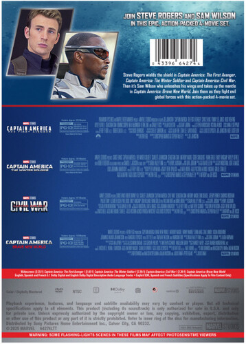 Steve Rogers wields the shield in Captain America: The First Avenger, Captain America: The Winter Soldier and Captain America: Civil War. Then it’s Sam Wilson who unleashes his wings and takes up the mantle in Captain America: Brave New World. Join them as they fight evil global forces with this action-packed 4-movie set.