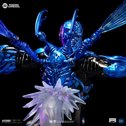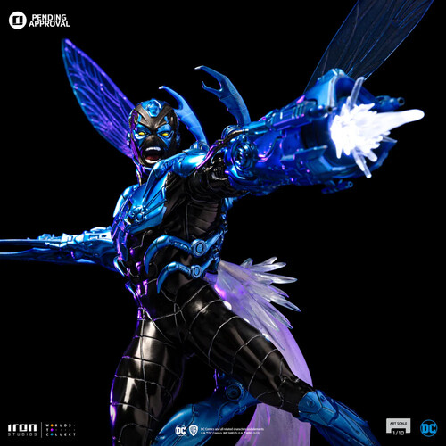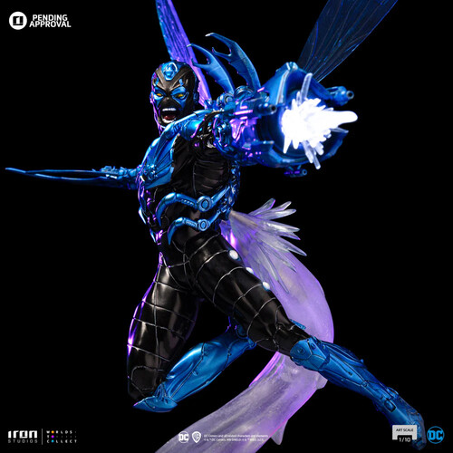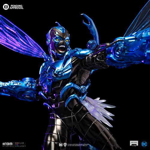 Flying in high speed, boosted by energy explosions from a jet engine on his back, the young, armored hero reaches greater maneuverability thanks to a pair of insect-like translucent wings. Wearing an extraterrestrial costume capable of reconfiguring itself to create a wide array of tools and weapons; a pair of pincers in the shape of small claws come out of his shoulders, protecting his head and back; while his right arm takes the form of big claws just like a scarab, his left arm becomes an energy blaster cannon, shooting rays against his enemies. With combat fury in his countenance, Iron Studios present the statue "Blue Beetle - DC Comics series #8 - Art Scale 1/10", with the armored hero with his blue and black armor described both as a technological artifact and a living entity.