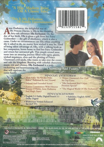 Oscar-winner Anne Hathaway delivers an enchanting performance in this unforgettable, modern fairy tale costarring Vivica A. Fox, Cary Elwes, Hugh Dancy, Steve Coogan, and Minnie Driver. On the day she's born, Ella (Hathaway) is given the gift of obedience by her Fairy Godmother. Unable to refuse to do anything she's asked-no matter how wicked-Ella sets off to return the "gift." But her simple journey soon turns into an amazing magical adventure bursting with colorful characters, music, wit, and whimsy.