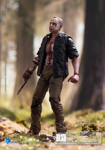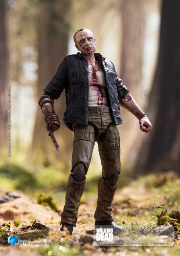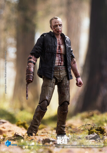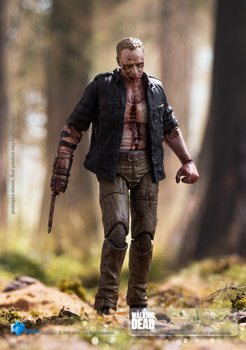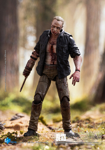 This brand-new EXQUISITE MINI Series Merle Walker Version action figure stands approximately 10.5 cm tall, faithfully recreating his appearance from The Walking Dead. Sculpted with exceptional detail, figure featuring a body covered in wounds, scars, and dried blood, with pale gray, decayed skin that perfectly captures his walker appearance. Features shirt exposing wounds and blood-soaked fabric, while his iconic right-arm prosthesis recreated with rusted textures and blood stains.
