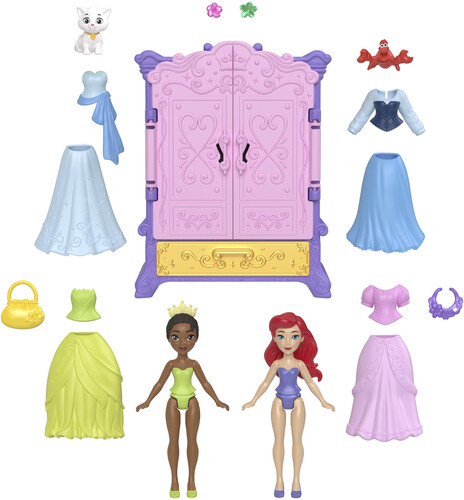 Ariel and Tiana small dolls (3.5 inches) each come with two looks inspired by the Disney movie, plus fashion accessories like a purse and necklace and pretty flower pieces to decorate them with. Fashions and accessories can be stored in the wardrobe that includes pegs for hanging clothes and a large drawer that pulls open.