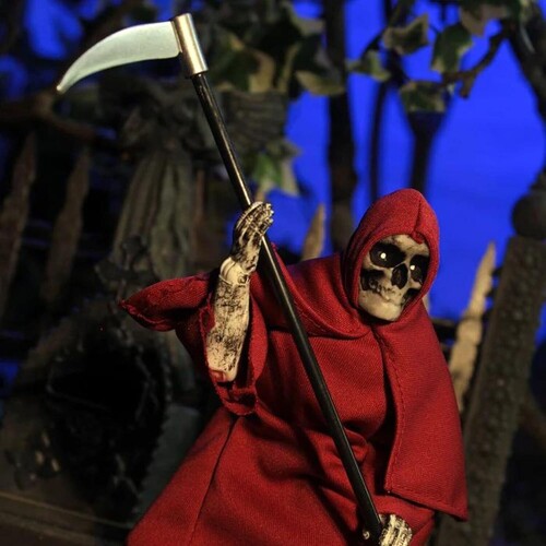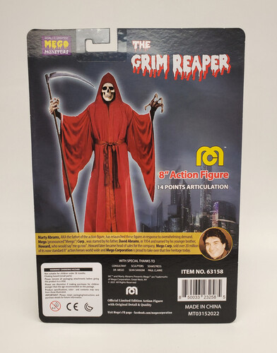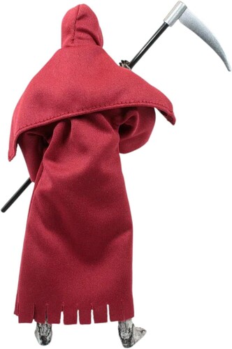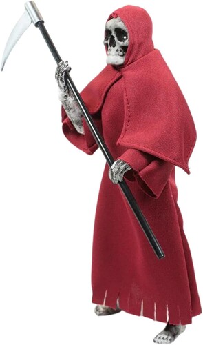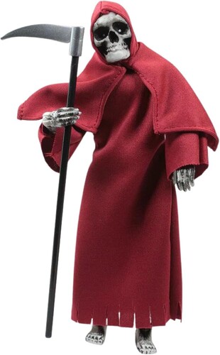 The Grim Reaper 8" figure features completely black skull, body, and robe with his scythe for reaping souls, and comes packaged on an illustrated retro-style blister card.