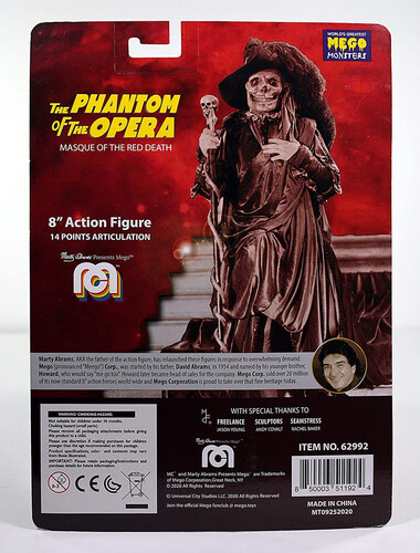 Based on Lon Cheney, Sr.'s performance in Universal's silent classic The Phantom of the Opera, this figure of the Phantom dressed as the Red Death stands about 8" tall and comes packaged with character specific accessories in a retro style blister card.