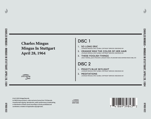 2 Disc Set. On a captivating night in April 1964, Stuttgart, Germany, became the epicentre of jazz innovation as Charles Mingus graced the stage with an ensemble of legendary talent. Known for his explosive creativity and magnetic presence, Mingus was not just a bassist; he was a revolutionary composer whose work shattered the conventional boundaries of jazz, crafting intricate narratives that spoke to the soul. As the lights dimmed, the audience was treated to a stellar lineup featuring the virtuosic Eric Dolphy on alto saxophone, flute, and bass clarinet. Dolphy's adventurous spirit wove seamlessly with Mingus's compositions, blending whimsy and urgency in a way that only he could. The powerful tenor saxophone of Clifford Jordan added depth, while Jaki Byard's piano work-rich and soulful-infused each piece with harmonic complexity. Holding it all together was the dynamic drumming of Dannie Richmond, Mingus's trusted collaborator, whose rhythmic inventiveness made every beat feel alive.