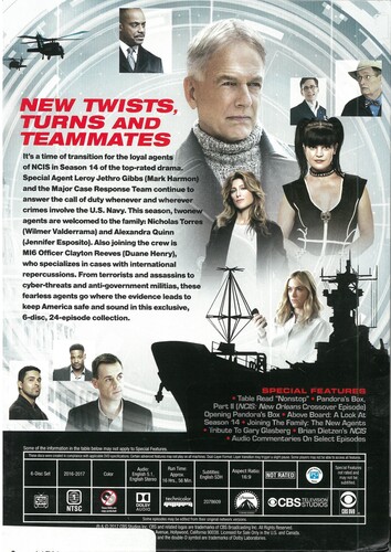 Investigate New Twists & Teammates It's a time of transition for the loyal agents of NCIS in Season 14 of the top-rated drama. Special Agent Leroy Jethro Gibbs (Mark Harmon) and the Major Case Response Team continue to answer the call of duty whenever and wherever crimes involve the U.S. military or jeopardize national security. This season, two new agents are welcomed to the family: Nicholas Torres (Wilmer Valderrama) and Alexandra Quinn (Jennifer Esposito). Also joining the crew is MI-6 Officer Clayton Reeves (Duane Henry), who speciales in cases with international repercussions. From terrorists and assassins to cyber-threats and anti-government militias, these fearless agents go where the evidence leads to keep America safe and sound in this exclusive 6-disc, 24-episode collection.