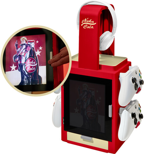The Nuka-Cola Gaming Locker is the ideal gaming accessory for fans of Bethesda’s Fallout series. Taking inspiration from the iconic beverage, the locker boasts a stylish red design with the headphone mount sporting the classic logo in gold, along with a vintage poster of Nuka-Girl on the door, as seen on billboards in the Wasteland. The door illuminates at a press of the touch-capacitive handle to give a soft subtle glow that will compliment any gaming setup.