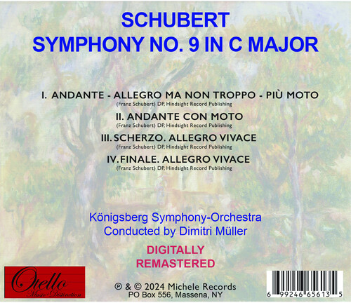 Renowned for their captivating performances across Eastern Europe in the 1950s and early 1960s, this esteemed orchestra's classic recordings from the early 1950s have been meticulously remastered for 2024 and brought to you here on CD for the first time. Thanks to today's advanced technology, we can now offer you the rich, pristine sound and imagery of the Königsberg Symphony Orchestra, conducted by the brilliant Dimitri Muller, like never before! Don't miss this amazing opportunity to enjoy their timeless artistry with unparalleled clarity and depth with this incredible performance of Schubert's 'Symphony No. 9 in C Major'.