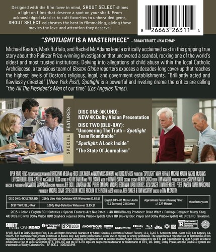 In 2001, the Boston Globe chose to dig into the long-whispered rumors that the city's Catholic Archdiocese had been hushing up sexual molestation claims for decades. The dogged and dicey investigation by editor Robby Robinson (Michael Keaton) and his staffers (Mark Ruffalo, Rachel McAdams, Brian d'Arcy James), and the aftershocks that roiled the world and the Church, are rivetingly recounted in this ensemble piece. Director Tom McCarthy's ("The Station Agent") drama won Oscars for Best Picture and Original Screenplay and co-stars Liev Schreiber, John Slattery, Stanley Tucci. 128 min. Widescreen; Soundtrack: English. Two-disc set.