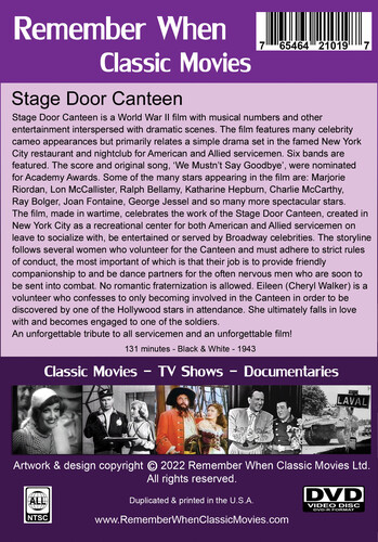 Stage Door Canteen is a World War II film with musical numbers and other entertainment interspersed with dramatic scenes. The film features many celebrity cameo appearances but primarily relates a simple drama set in the famed New York City restaurant and nightclub for American and Allied servicemen. Six bands are featured. The score and original song, 'We Mustn't Say Goodbye', were nominated for Academy Awards. Some of the many stars appearing in the film are: Marjorie Riordan, Lon McCallister, Ralph Bellamy, Katharine Hepburn, Charlie McCarthy, Ray Bolger, Joan Fontaine, George Jessel and so many more spectacular stars. The film, made in wartime, celebrates the work of the Stage Door Canteen, created in New York City as a recreational center for both American and Allied servicemen on leave to socialize with, be entertained or served by Broadway celebrities. The storyline follows several women who volunteer for the Canteen and must adhere to strict rules of conduct, the most important of which is that their job is to provide friendly companionship to and be dance partners for the often nervous men who are soon to be sent into combat. No romantic fraternization is allowed. Eileen (Cheryl Walker) is a volunteer who confesses to only becoming involved in the Canteen in order to be discovered by one of the Hollywood stars in attendance. She ultimately falls in love with and becomes engaged to one of the soldiers. An unforgettable tribute to all servicemen and an unforgettable film! (131 minutes - 1943 - Black & White - 4:3)