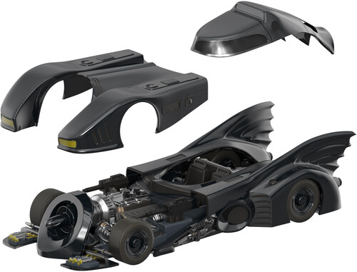 Remove the pair of exterior panels on the top of the vehicle to expose the intricate inner workings of the Caped Crusader’s crime-fighting vehicle, including a supercharged V-12 engine flanked by twin forward-mounted machine guns, a cockpit with detailed telecommunications array and rotating steering wheel, rear-mounted oil slick dispensers and smoke emitters, and a turbine exhaust afterburner.