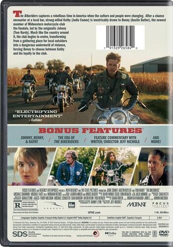 The Bikeriders captures a rebellious time in America when the culture and people were changing. After a chance encounter at a local bar, strong-willed Kathy (Jodie Comer) is inextricably drawn to Benny (Austin Butler), the newest member of Midwestern motorcycle club, the Vandals led by the enigmatic Johnny (Tom Hardy). Much like the country around it, the club begins to evolve, transforming from a gathering place for local outsiders into a dangerous underworld of violence, forcing Benny to choose between Kathy and his loyalty to the club.