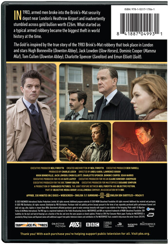 It was one of the biggest robberies in British history: The 1983 break-in at the Brink's-Mat warehouse, where thieves looking for £1 million in Spanish coins walked out with £26 million in gold bullion and other treasure. The further efforts between the conspirators to fence their ill-gotten gains, and the pursuit of the case by the authorities, is remarkably dramatized in this BBC One series; Hugh Bonneville, Dominic Cooper, Charlotte Spencer, Jack Lowden, Tom Cullen, Sean Harris, Emun Elliott, Adam Nagaitis star.6 episodes on 2 discs. 6 hrs. Widescreen; Soundtrack: English.