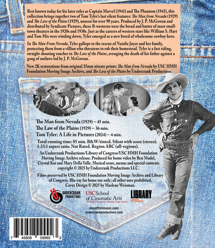 Best known today for his later roles as Captain Marvel (1941) and The Phantom (1943), this collection brings together two of Tom Tyler's last silent features: The Man from Nevada (1929) and Law of the Plains (1929), unseen for over 90 years. Produced by J. P. McGowan and distributed by Syndicate Pictures, these B-westerns were the bread and butter of most small-town theaters in the 1920s and 1930s. Just as the careers of western stars like William S. Hart and Tom Mix were winding down, Tyler emerged as a new breed of wholesome cowboy hero. - In The Man From Nevada, Tyler gallops to the rescue of Natalie Joyce and her family, protecting them from a villian who threatens to rob their homestead. Tyler is a fast riding, straight shooting rancher in Law of the Plains, avenging the death of his father against a gang of outlaws led by J. P. McGowan. - New 2K restorations from original 35mm nitrate prints: The Man from Nevada by USC HMH Foundation Moving Image Archive, and Law of the Plains by Undercrank Productions. - Blu-ray is Region ABC (all-regions).
