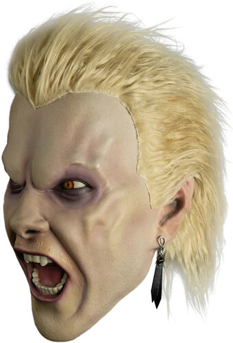 The hard plastic face mask features an elastic strap for comfortable wear with earring and attached hair to create the perfect look for Halloween or your next stroll down the Santa Carla boardwalk.