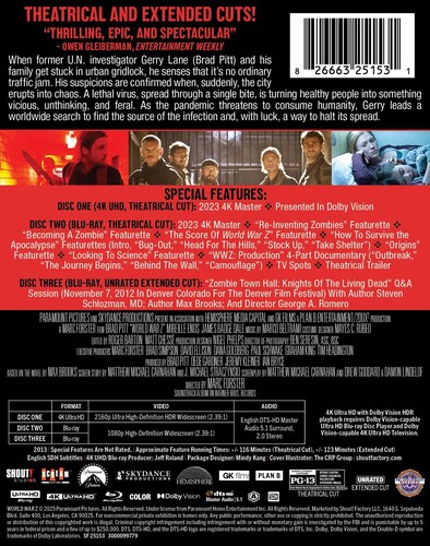 World War Z Steelbook 4K UHD Limited Edition United Nations employee Gerry Lane (Brad Pitt) is called upon to help stop the chaotic pandemic that has gripped populations around the world. Lane fights to keep his family safe, while searching for an answer to the outbreak before it destroys all of civilization. Number of discs : 3 Rated: PG-13 Run time : 1 hour and 56 minutes